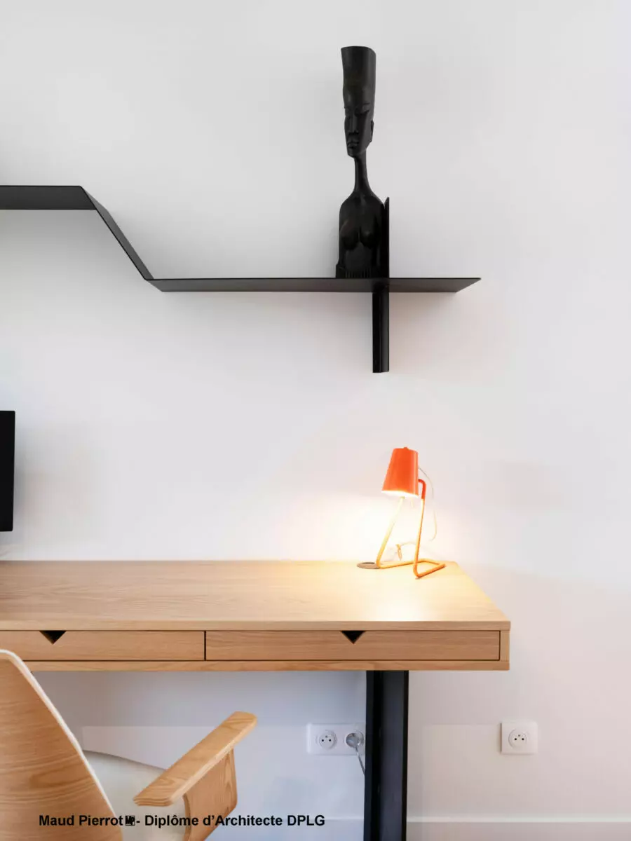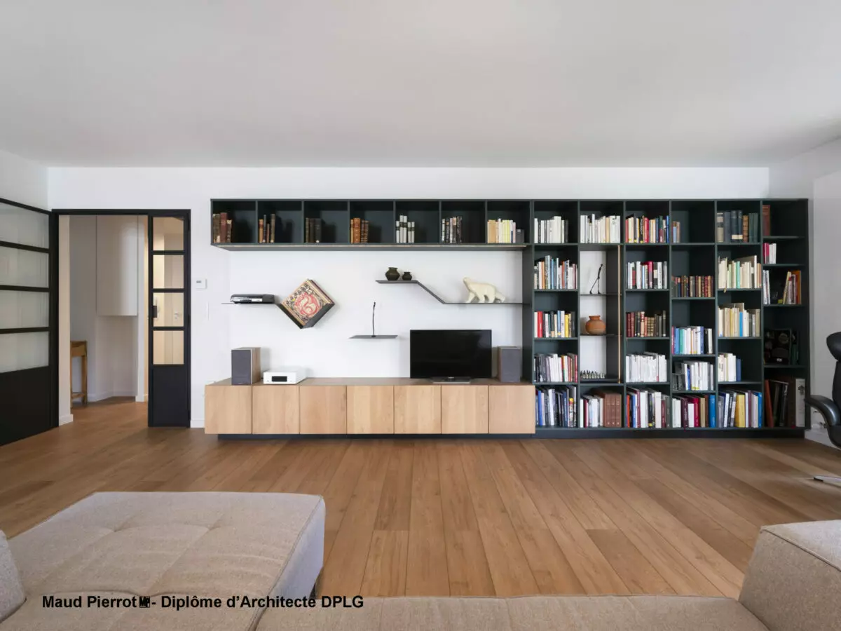 Une bibliothèque sur-mesure, pièce maitresse du projet, accueille une riche collection de livres anciens, chers au propriétaire. Un éclairage modulable crée différentes ambiances selon les moments de la journée. À proximité, un espace bureau pensé pour le télétravail offre confort et design élégant.