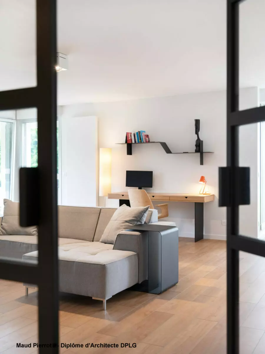 Pour la pièce principale, l’objectif était de repenser la distribution, de faire circuler la lumière naturelle et de redonner des fonctions claires à l’espace.