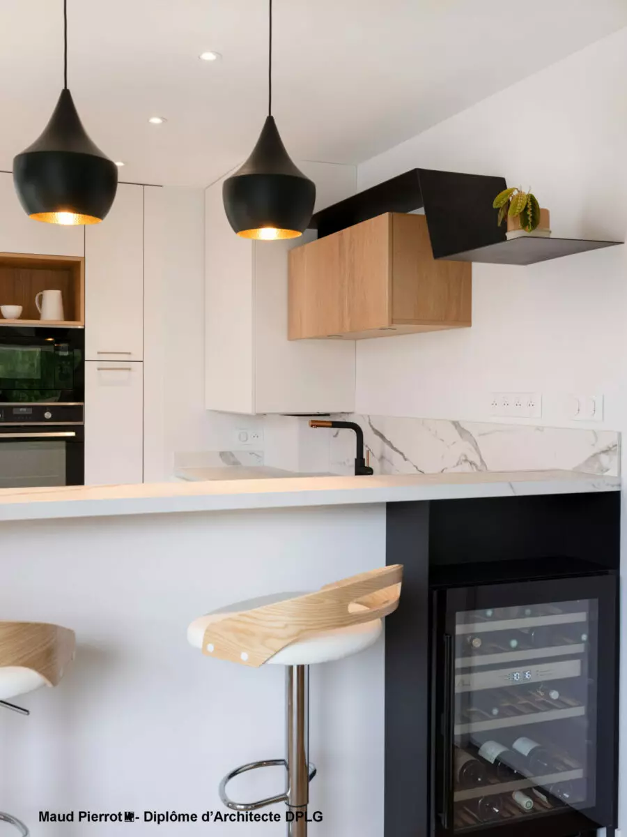 👉 Interventions : démolition, plâtrerie, carrelage, électricité, plomberie, menuiserie et métallerie sur-mesure, peinture, choix des luminaires et des éléments décoratifs.