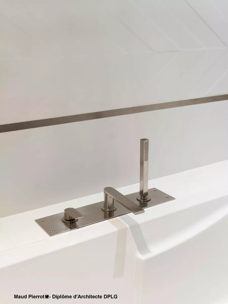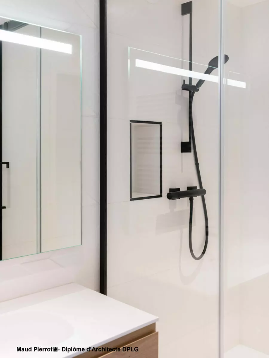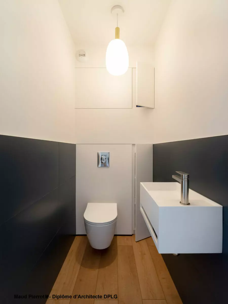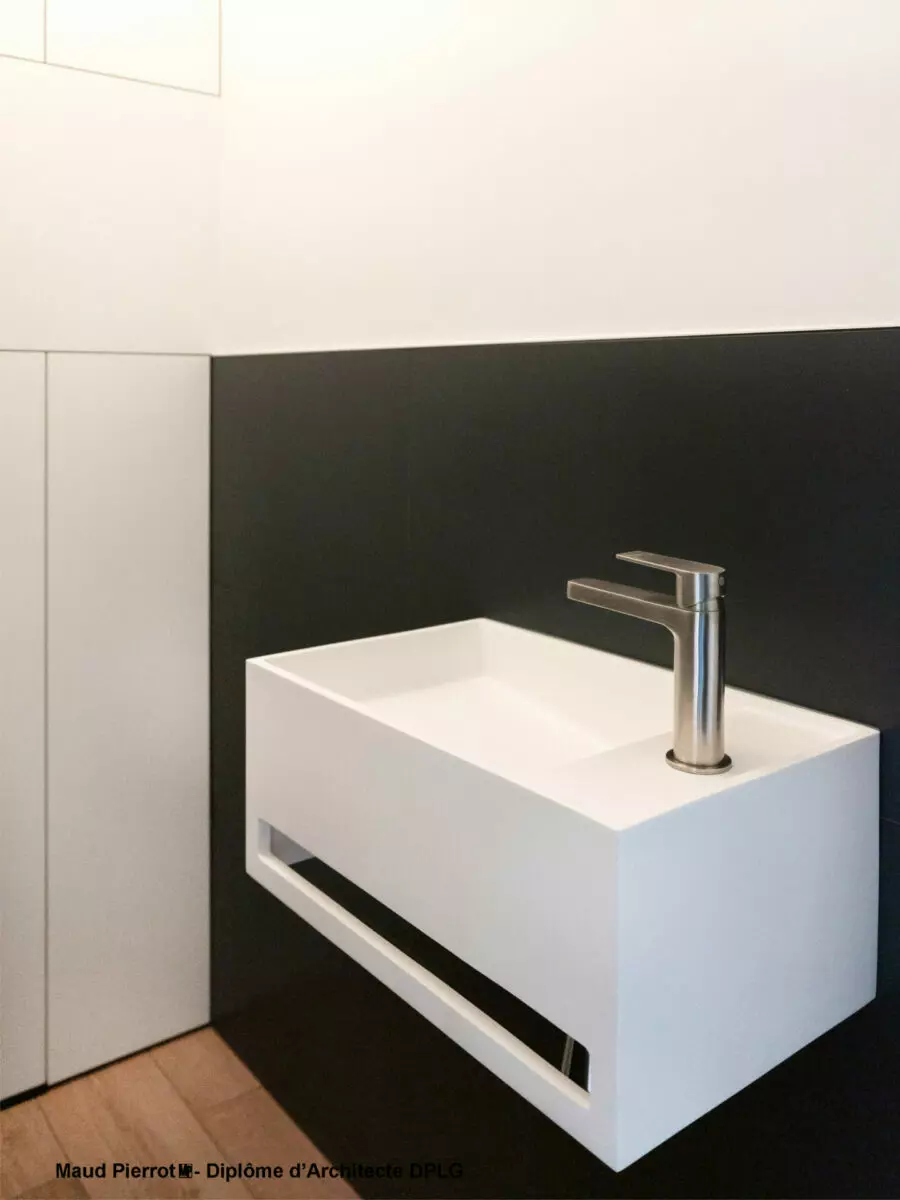 Les deux salles de bains contemporaines misent sur la sobriété et les matières. Le choix des faïences, avec le travail sur leurs textures et les finitions rythme les pièces. Dans les WC, un jeu de volumes dissimule le bâti-support et intègre des niches pratiques, grâce à un astucieux travail de volume en quinconce avec la niche de la douche.