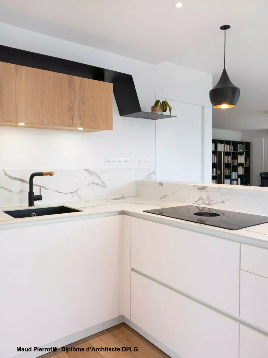 La cuisine s’est ouverte plus largement sur la pièce de vie. Son design épuré et minimaliste, communique désormais avec le séjour. Sa hotte cachée dans la plaque et ses lignes sobres permettent une intégration discrète et élégante dans la pièce de vie.