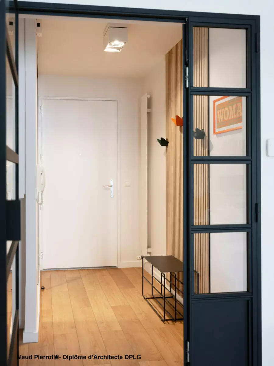 L’entrée a été optimisée avec une zone dédiée aux enfants et des rangements fonctionnels pour un usage quotidien.