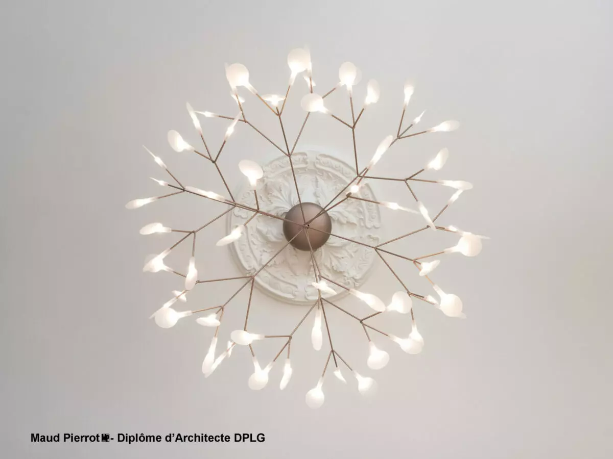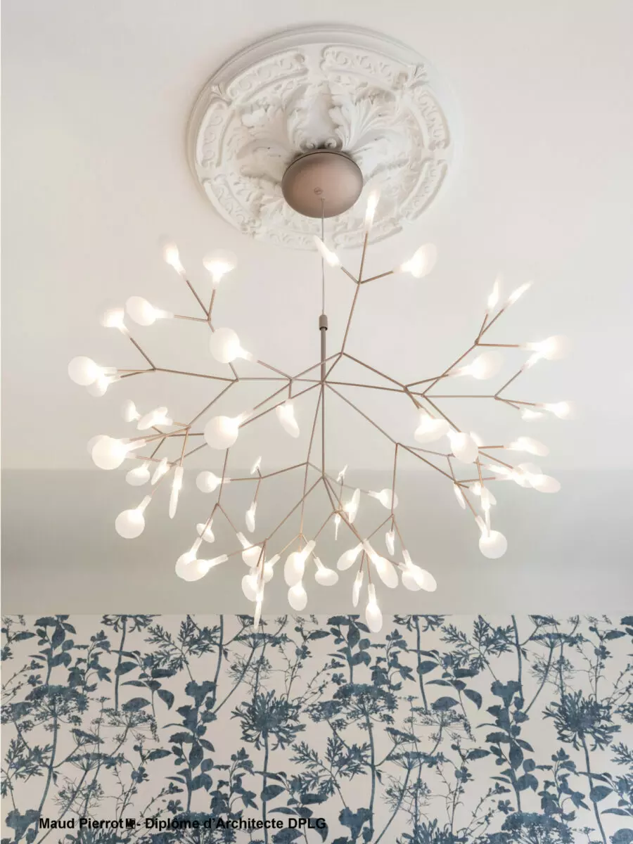 Un luminaire signé Moooi met en valeur la rosace d’origine du plafond et dialogue avec le décor végétal du papier peint, en écho à la vue sur le jardin.